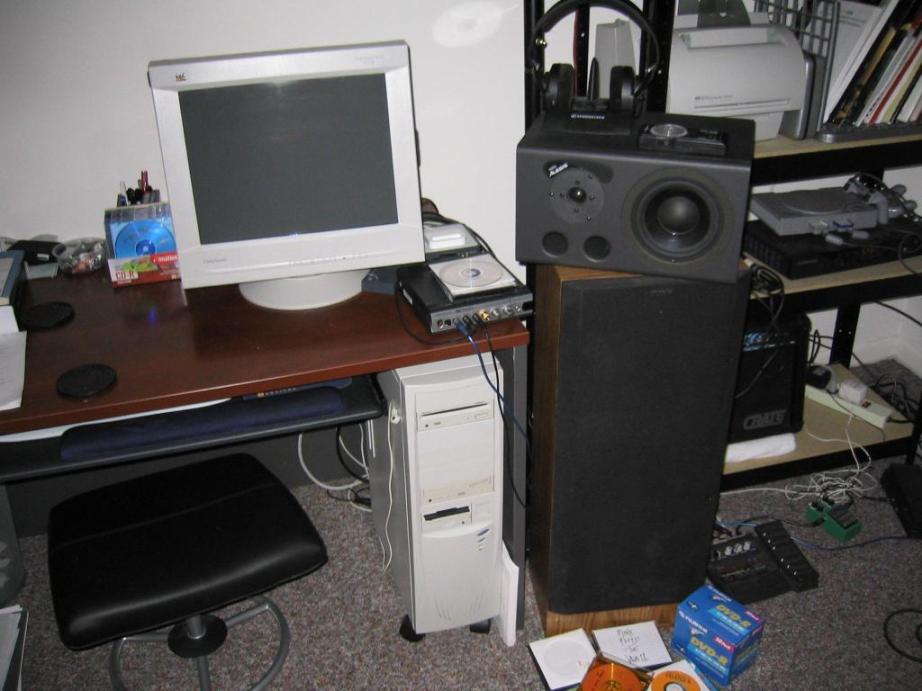 Check out my new quiet computer My studio at home is a pretty hacked together affair, but I am slowly upgrading. The centerpiece is a custom AMD Athlon XP 2500+ at 1.8GHz, with 1GB of RAM and approximately 120GB hard drive space. I just upgraded to a Soundblaster Audigy 2ZS Platinum Pro sound card: 108dB S/N, 24bit/96kHz recording and playback, an external hub--in my opinion, blurring the line between consumer and pro (really, all that's missing is more connectivity). I also have DVD and CD-RW drives, a 19 inch ViewSonic PF790 monitor, and a keyboard with the Dvorak layout (irrelevant to music, but lots of geek cred). I have a pair of Alesis M1 Active studio reference monitors, and Sennheiser RS65 wireless headphones (very nice). Also, a pair of old Sony 200W home theater speakers, run off a Sony amp so old I don't know its model number. My mixer is a Phonic MM1202 (what the hell is that!? you rightfully ask, to which I reply, a $50 piece of E-bay junk that is definitely the next part to upgrade). Instrument-wise, I have an Alesis QS8.1 88-key weighted keyboard, with plenty of sounds that are surprisingly decent. I have an Ibanez RG220B electric (gunmetal grey) with a Duncan Screamin' Demon pickup at the neck. I play through a Dunlop Crybaby 535Q wah, then an Ibanez TS9DX Turbo Tube Screamer (both great pedals), then a cheesy Zoom GFX707 multieffects board, and finally a pathetic Crate MX15R amp (actually 12watts, the cheap bastards!). I also have a Yamaha FG-432S acoustic. Oh, and my long-neglected Bach Stradivarius trumpet in a closet somewhere... Well, not the most impressive studio in the world. My primary criterion was bang for the...cent. But hey, at the end of the day, I can still get music out of it. As money comes my way it will no doubt head right back out the door into the waiting arms of Mackie, Marshall, MOTU... Click on the thumbnails for larger images: |